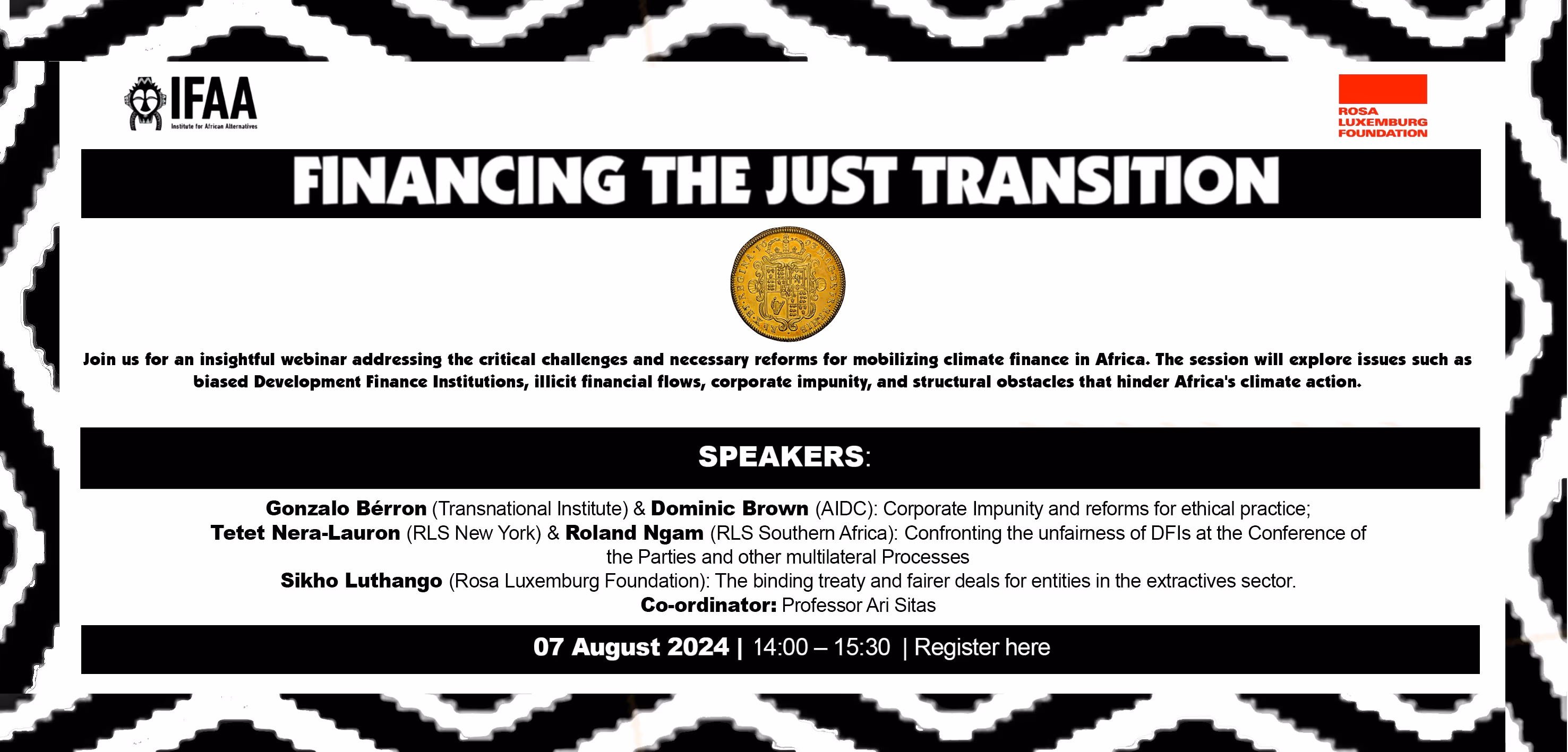 Join us for an insightful webinar addressing the critical challenges and necessary reforms for mobilizing climate finance in Africa. The session will explore issues such as biased Development Finance Institutions, illicit financial flows, corporate impunity, and structural obstacles that hinder Africa's climate action.