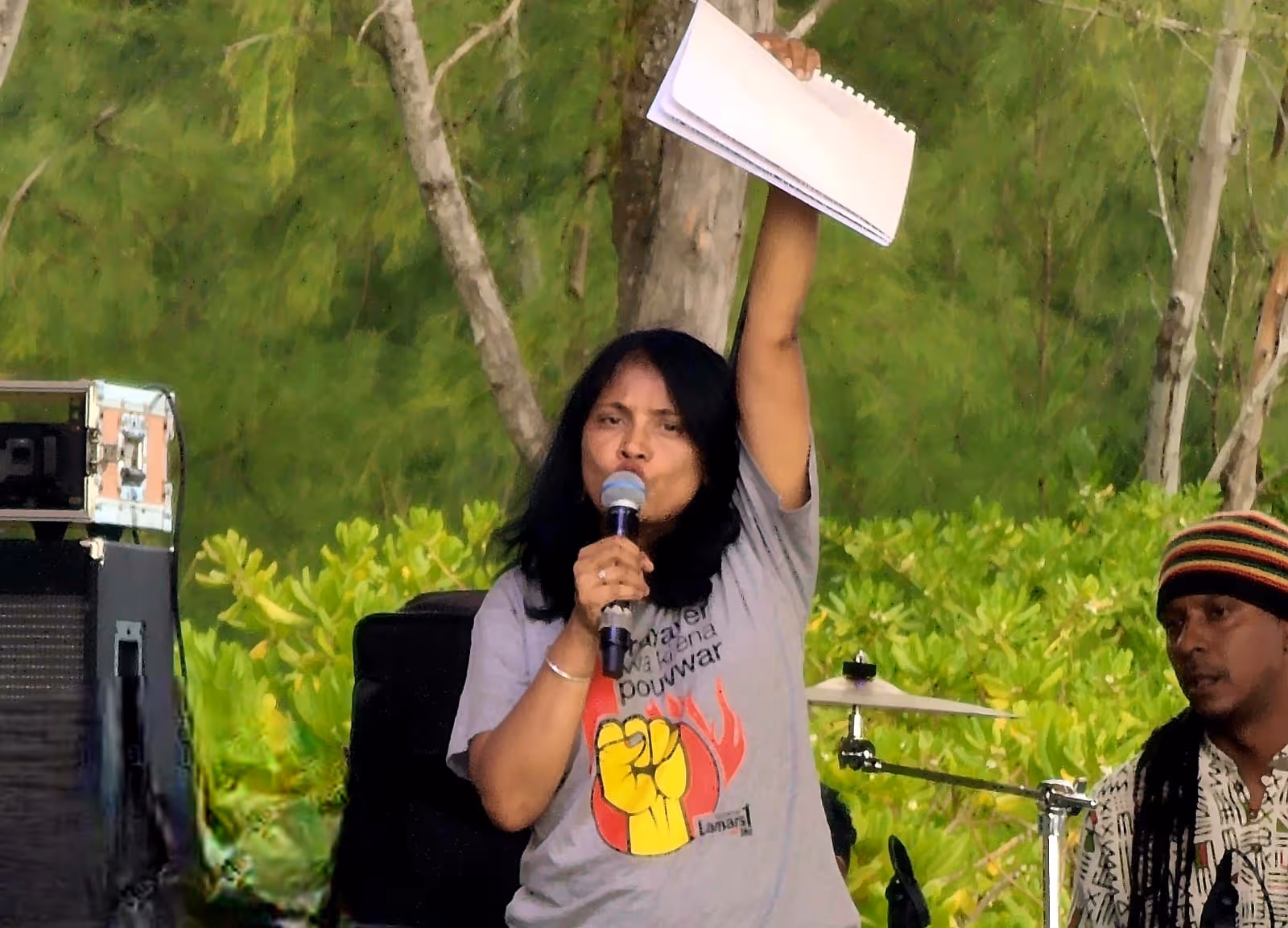 Things heat up around one o’clock in the afternoon when music bands start warming up the audience. All the musicians on show are also activists in their own right: Ragalayam, Emlyn/Langaz Ravann, Son of the Waves, Latanier, Racinetatane - late Kaya Band…Some of them were part of the Pomponette struggle. Others showed up to support the crowds when they were making sugarcane leaf booms at the peak of the Wakashio crisis. They are here again today, family, basically. Vahantsaina, from Madagascar who is a participant in the 2024 summer School of Ecology and a winner of a prestigious jazz competition, is also performs some of his greatest hits.