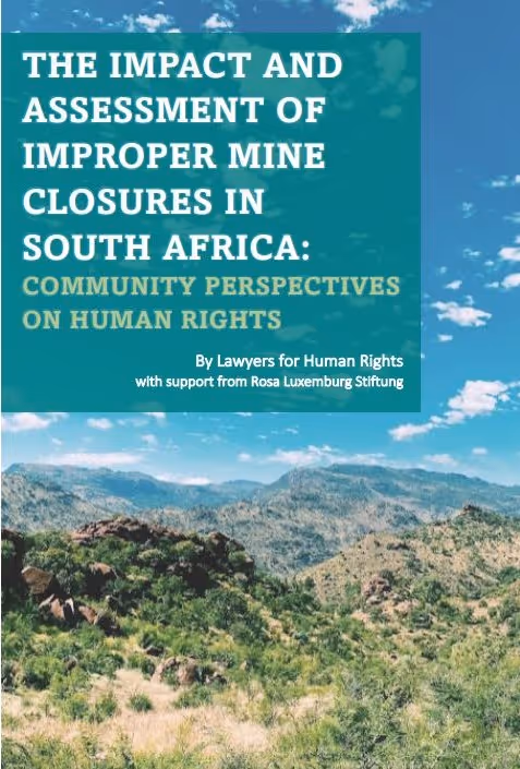This report is based on qualitative research on the reality of communities’ struggles for mining justice in South Africa. Qualitative research allows for a holistic study of community experiences, struggles, and movements without resorting to statistical procedures or other means of quantification. As a point of departure, the report details human rights violations as experienced by communities in the context of mine closures, as well as their perspectives on and alternatives to these violations. The main source of data for this report comes from consultations on the lived realities of communities and their representatives at local and national levels and supporting organisations. To supplement these experiences, the report relies on existing literature and research reports as well as Lawyers for Human Rights work on issues related to mining-affected communities and improper mine closure. The design of the research is both descriptive and explanatory in nature. The report seeks to illustrate the issues facing mining communities affected by closures as well as to provide human rights-based legal and social analyses on the causes of and potential solutions to these issues.